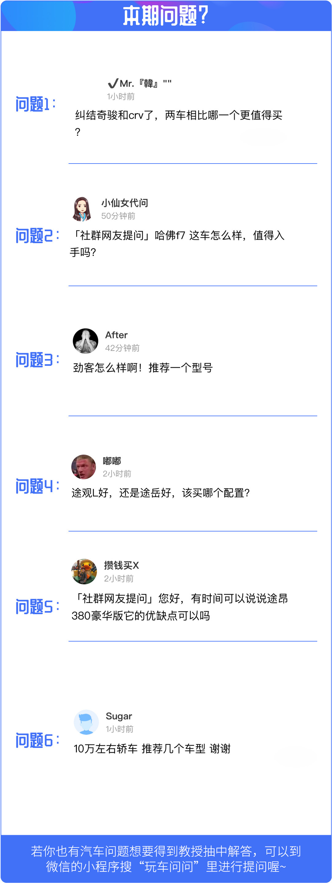在网友问答栏目中教授将会在小程序-玩车问问里挑选5个问题进行回复,如果对购车、用车有什么疑问的话,欢迎点击下方玩车问问小程序,有许许多多非常厉害的技师为你解答喔!