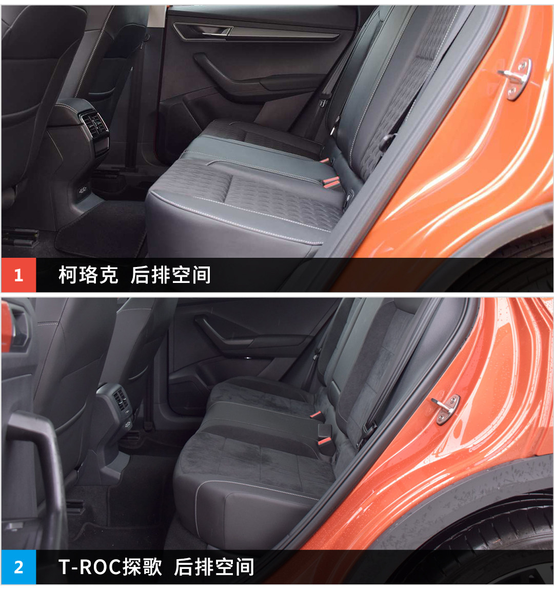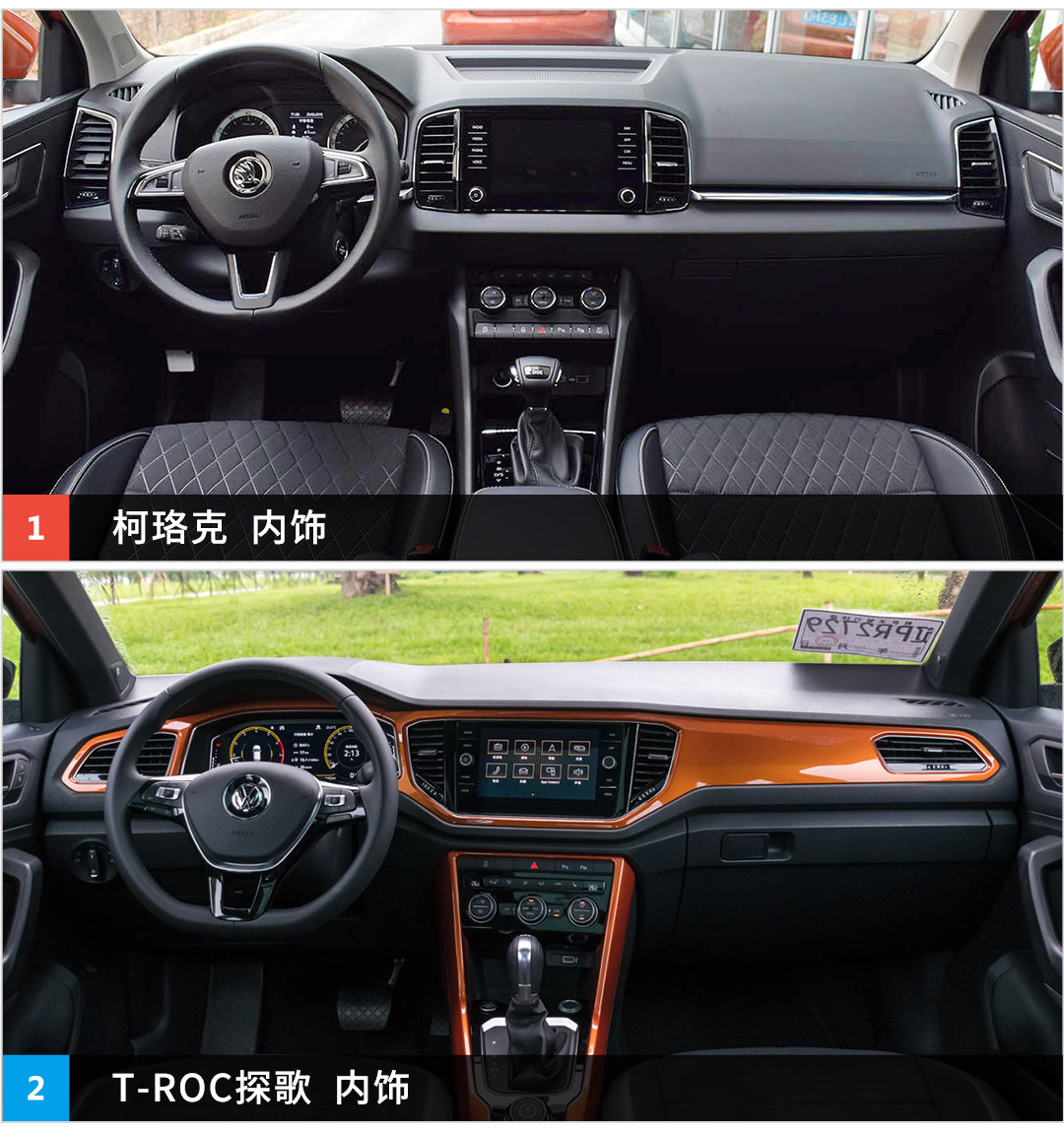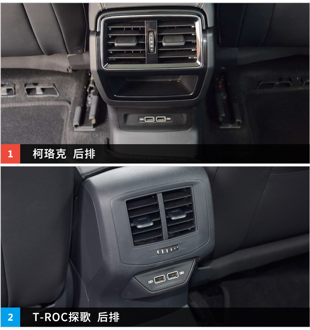 内饰上两款都继续遵循家族式设计,但两款的内饰其实都挺好看的。T-ROC探歌虽然有着更年轻化的设计,但是用料却很一般,采用的材料也是硬质的,做工虽说不错,但在用料方面和柯珞克的差距实在是太大了。柯珞克采用的材料是软质的,因此车内的质感会更好一些。而在座椅方面,两款车无论前排还是后排的包裹性都做得很好,这一点还是值得表扬。