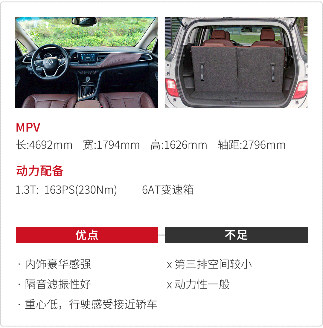 适合人群:对动力要求不高,但是注重豪华高级感、隔音滤振性,并喜欢GL6这种轿车化外观的消费者。