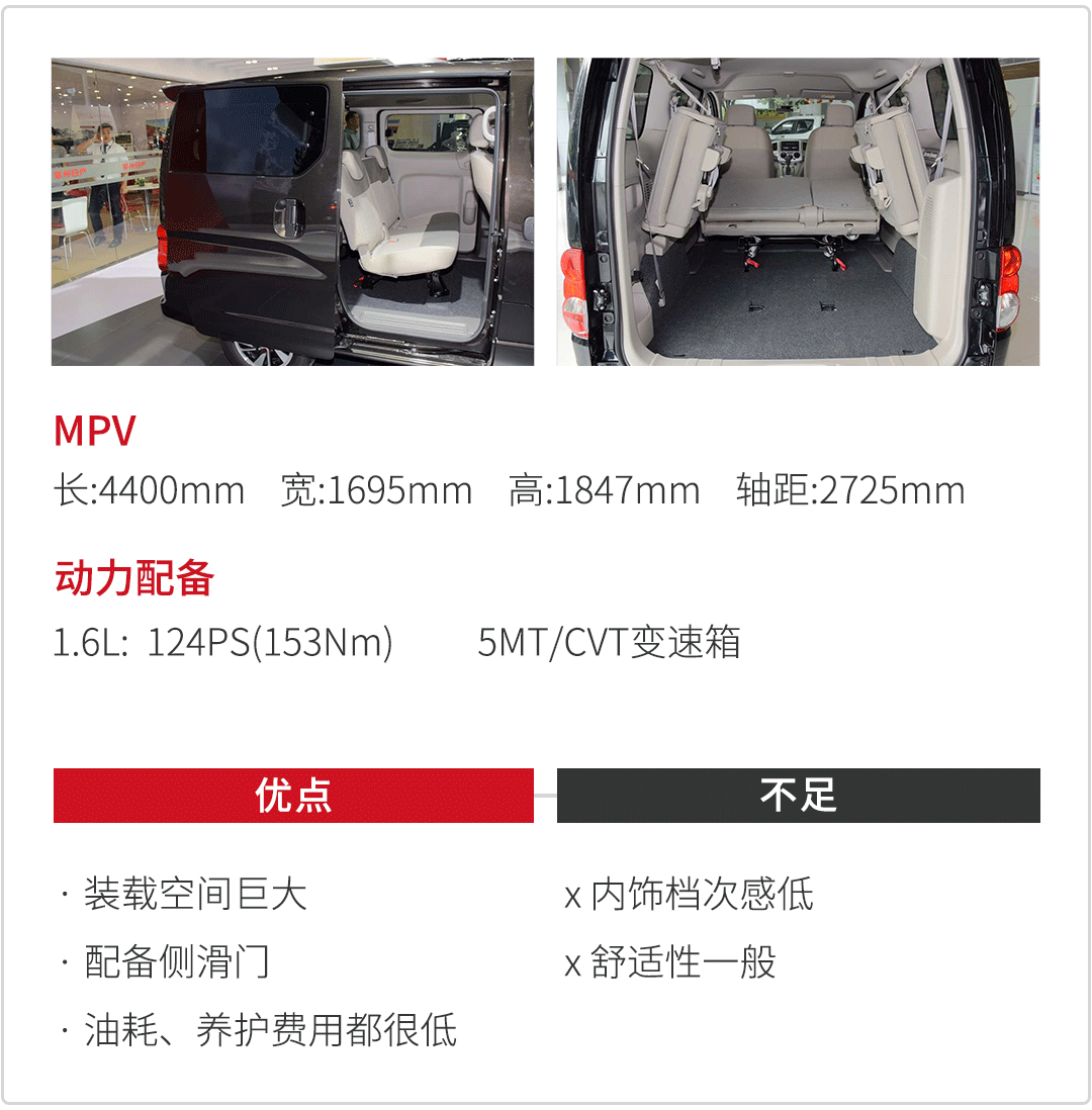 日产NV200是15万内少数配备双侧侧滑门的MPV之一,其侧滑门打开后的开口很大,老人和小孩上下车十分方便。而且NV200的后排座位能够轻松收纳和拆卸,配合方正高大的车身外观,兼职做一下货运都没问题。同时NV200也是一台非常好养的车,引擎变速箱都和经典轩逸同款,零部件满大街都能找到,只要你能接受它比较廉价的内饰设计和用料,那这款车就可以说家用靠谱省油,运货则是回本神器。