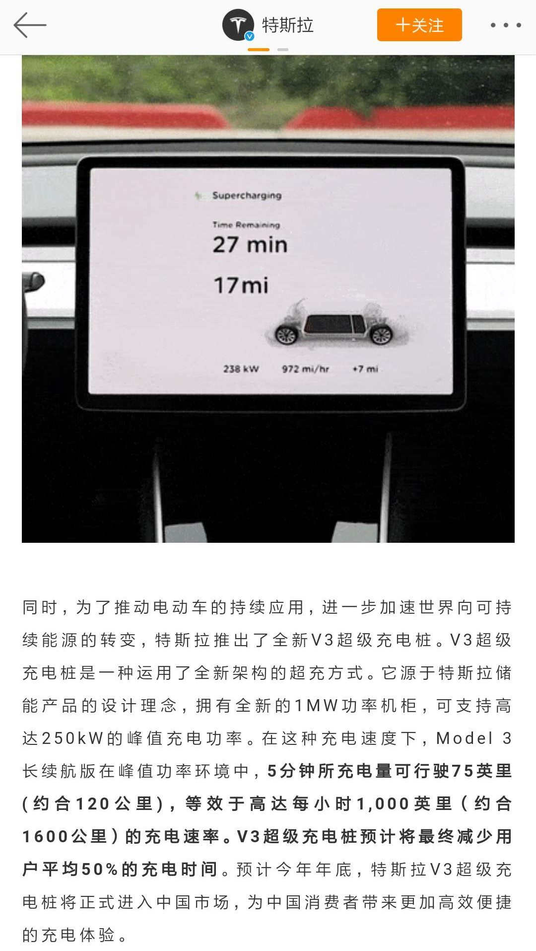 另外,在充电速度上,特斯拉也是遥遥领先的一个。特斯拉超充站的充电功率是150kW(最近OTA升级后的功率),日后升级Supercharger V3的话(今年5月17日特斯拉已经宣布今年年底在中国升级Supercharger V3),充电功率可以达到250kW,这是model 3可以支持的充电速度。