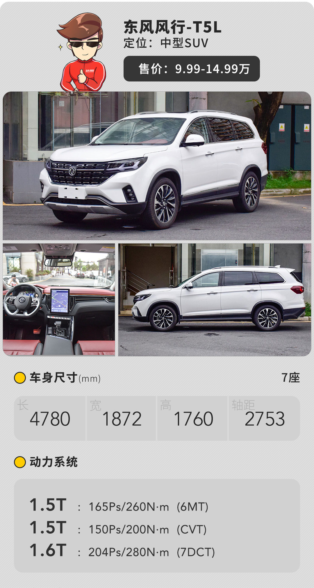风行T5L出自东风柳汽,今年3月份刚上市的新车,是在T5的基础上进行加长而得来的产物。轴距达2753mm,车身尺寸处在中型SUV的平均水平。该车的外观和内饰均与T5相同,甚至起售价也完全一样,真实的“加量不加价”。