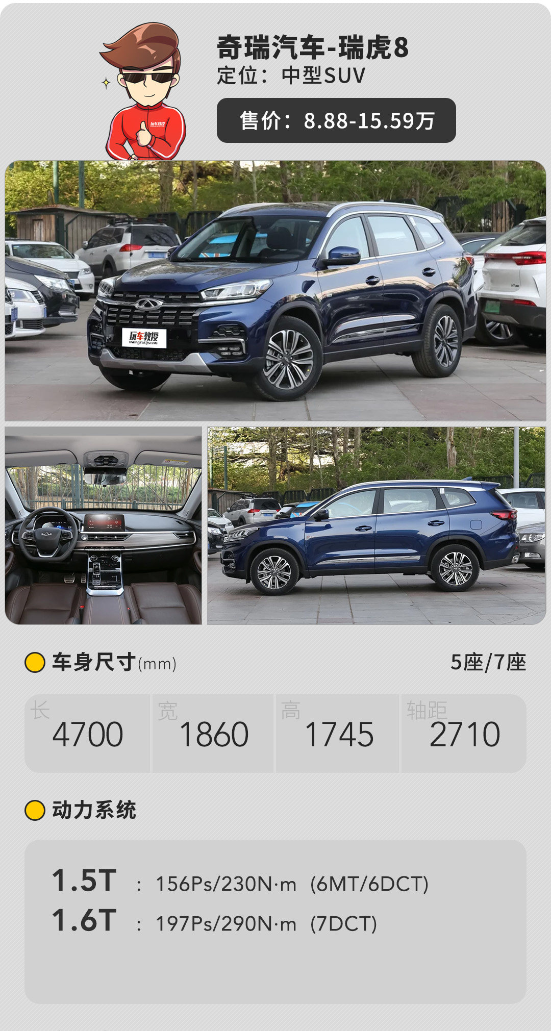 那么瑞虎8究竟值不值得买呢?首先得说明它的不足,内饰精致感很差,按键手感生涩,变速箱换挡慢,加速能力一般。但是在10万左右的售价区间内,它拥有前后独立悬架、全景天窗、10.25英寸大尺寸中控屏、国六标准的发动机,在安全配置上该有的也一个不少,并且它是一部塞得下7张座椅的的中型SUV,奇瑞还提供十年或一百万公里的延保,它在这个价位显示出了相当的诚意,值得购买。