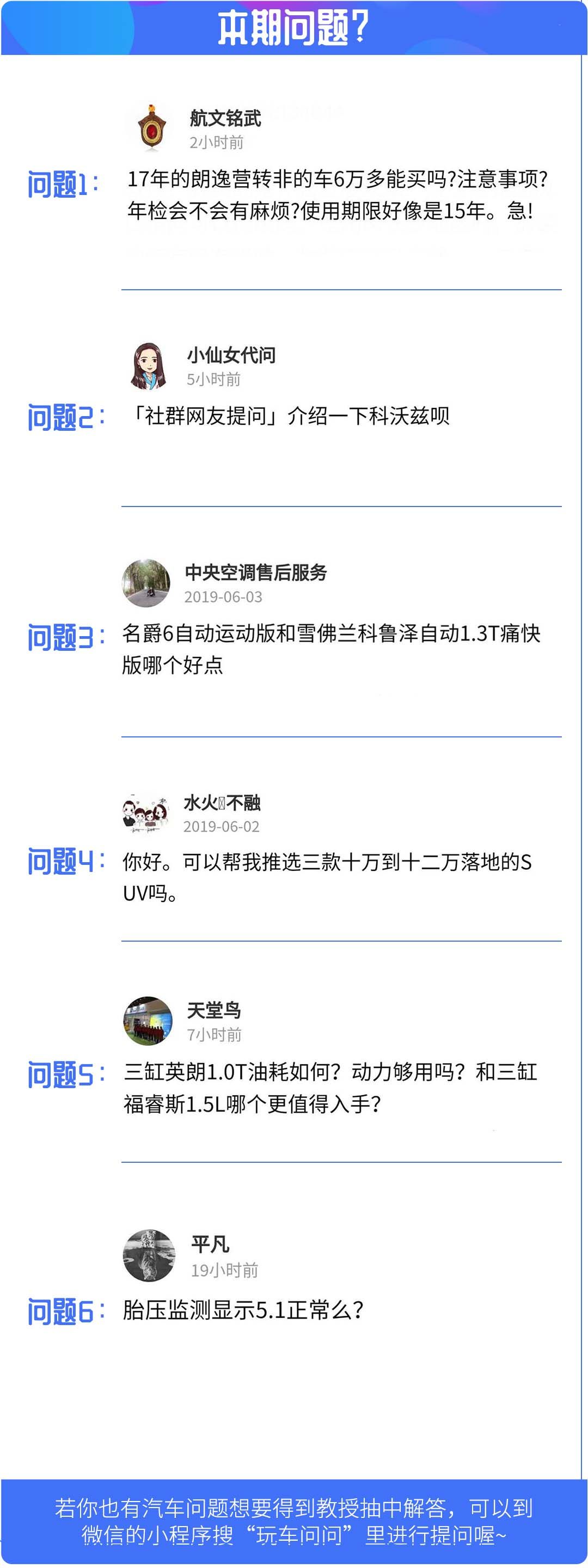 在网友问答栏目中教授将会在小程序-玩车问问里挑选5个问题进行回复,如果对购车、用车有什么疑问的话,欢迎点击下方玩车问问小程序,有许许多多非常厉害的技师为你解答喔!