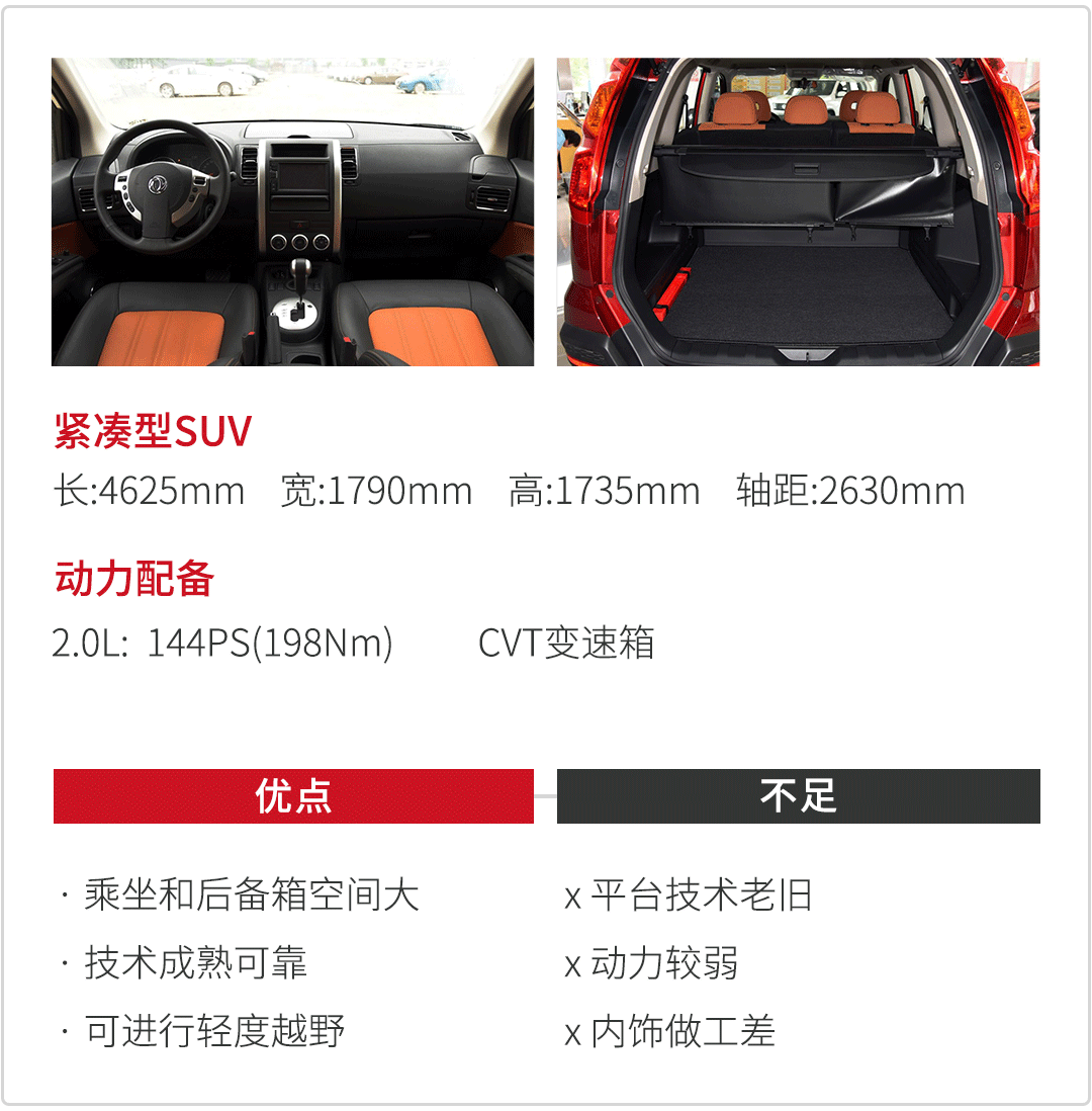 看到风度MX6的外观,你会觉得似曾相识,没错,它就是日产上一代奇骏的换标车,除了车标和极少数的细节设计外,风度MX6其它方面的表现都和老奇骏完全一样,就连发动机、变速箱、四驱系统也是日产原装部件,所以可靠性和油耗表现都十分不错。此外风度MX6方正的车身外观既让它略带几分硬派SUV的阳刚气息,又让它的内部装载空间巨大,加之还继承了老奇骏在城市SUV当中较强的烂路行驶能力,开着它外出自驾游再合适不过了。