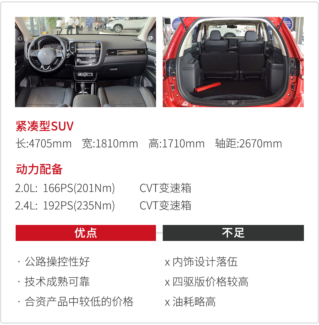 欧蓝德是合资紧凑型SUV中内部空间数一数二,且少数拥有三排七座布局可选的车型。它的外观造型还是相对年轻运动的,而且主观视觉感受上非常显大,乍一看还有点中型SUV的感觉,这就又恰好迎合了父母辈中年人以大为美的审美观念。而在可靠性方面自然也是不用担心,欧蓝德的动力总成使用了相对成熟的技术,引擎和变速箱都是搭档多年的老伙计,并且三菱在可靠性方面的口碑一直以来也很好。