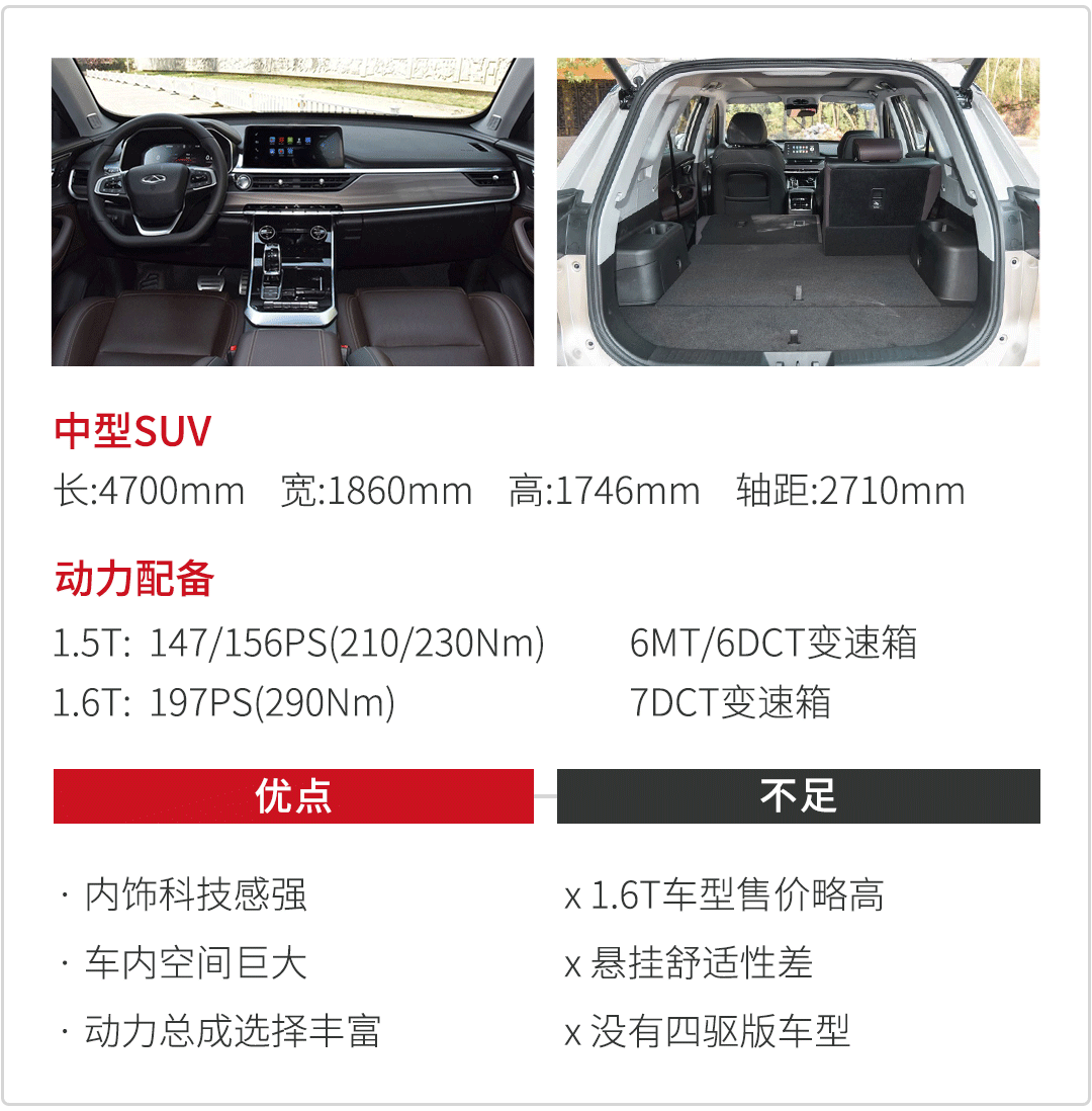 瑞虎8则是一台性价比非常高的自主品牌中型SUV,这首先体现在售价上,最低配手动挡车型售价不足9万,自动档车型的起步价也仅需10万出头,配置丰富程度和空间方面又足以吊打大部分同价位合资对手,而购买同尺寸相似配置的合资产品的话怎么也得20万往上了。并且瑞虎8还有三种动力可选,如果您的所在地暂未实施国6排放,那么可以买1.5T低功率版车型,如果您所在地即将实施国6且对动力要求不高,那就买1.5T高功率版,对动力有需求则买1.6T车型。