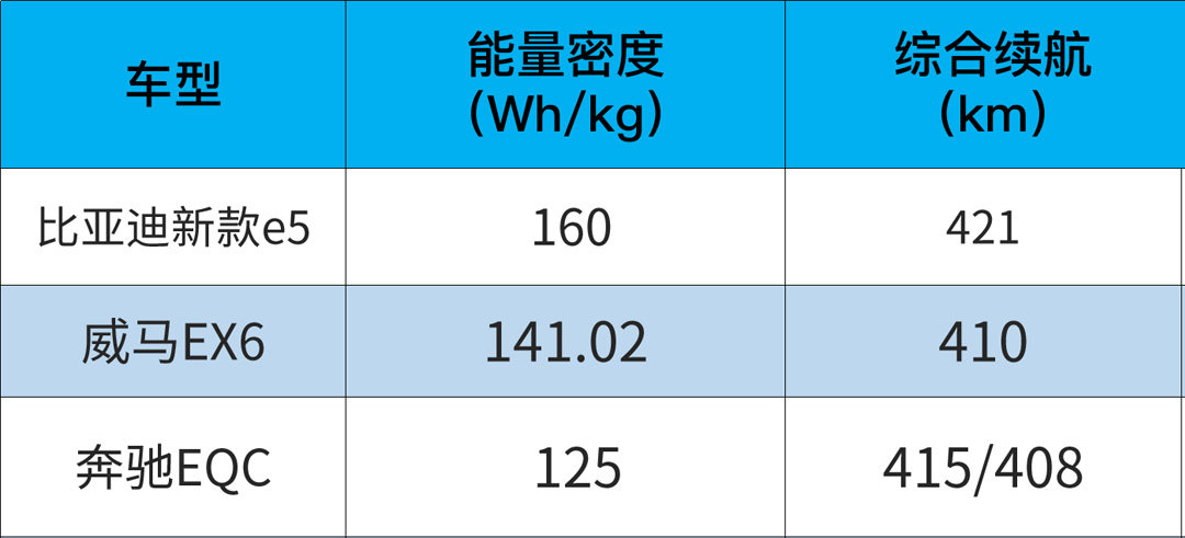 从这个表格中我们可以直观看到,比亚迪即将要推出的新款e5电池能量密度和综合续航里程尤为突出。而威马EX6、奔驰EQC通过大容量的电池组,也具备较强的续航里程!