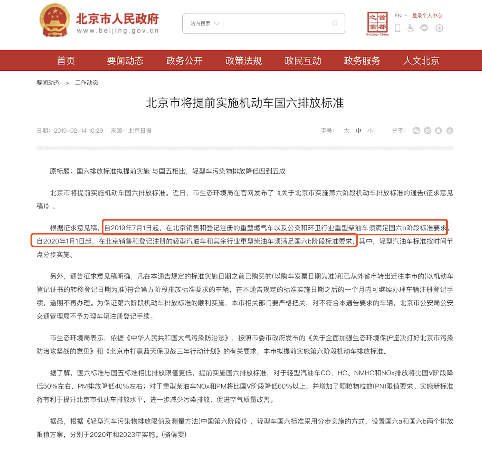 例如北京、上海、广州都分别出台了政策,在2019年7月开始实施国六排放标准,深圳甚至在2018年11月份就开始执行国六排放标准。