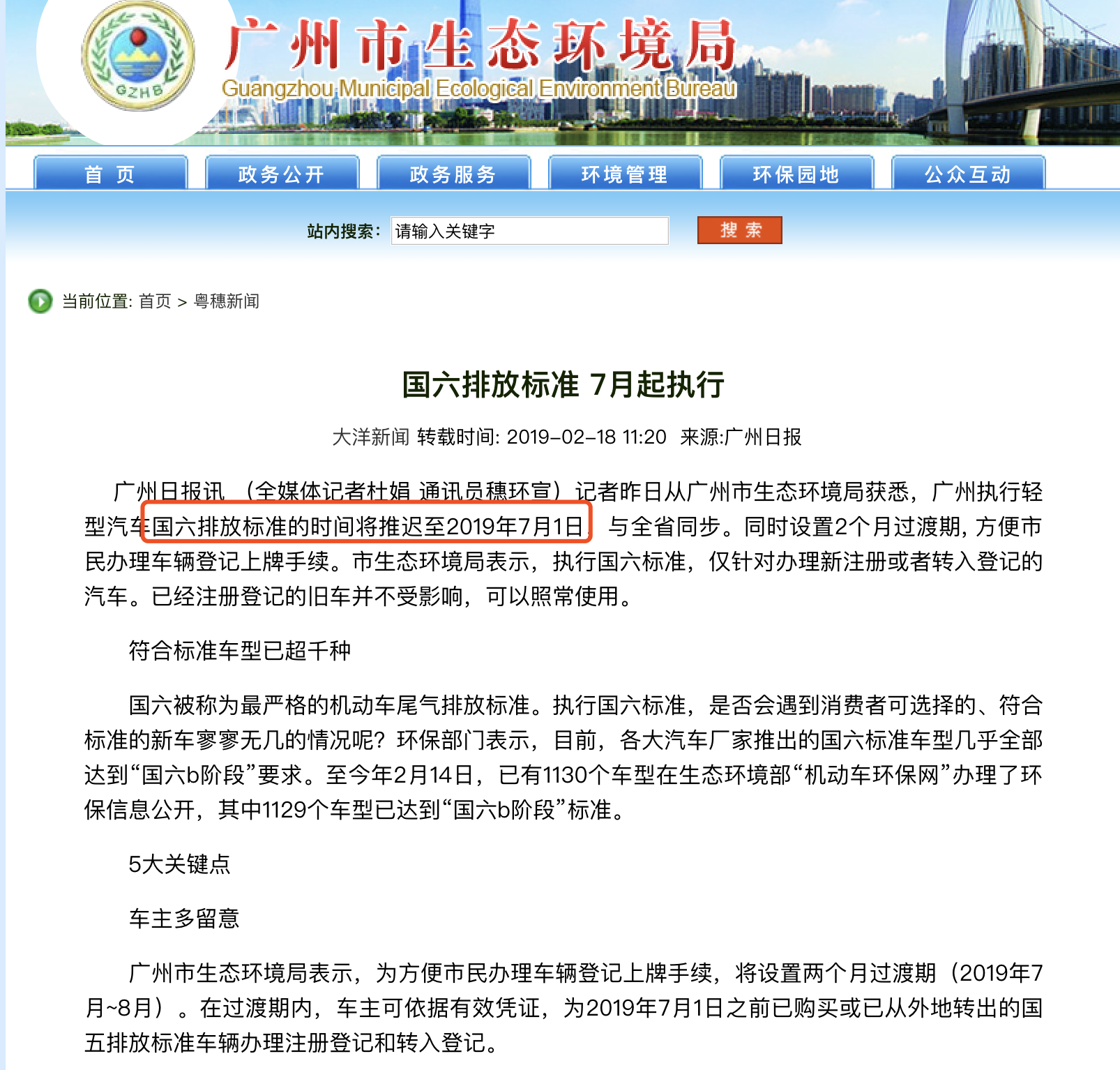 广州市生态环境局发布通告“国六排放标准,7月起执行”