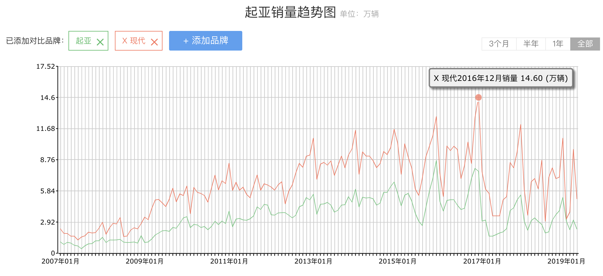从上图的销量表中可知,韩系两大品牌起亚和现代在2016年末达到销量顶峰后便一路直下,两大品牌2016年12月总销量超过22万辆,然而今年4月总销量不过7.36万辆,简直是腰斩式的下跌。
