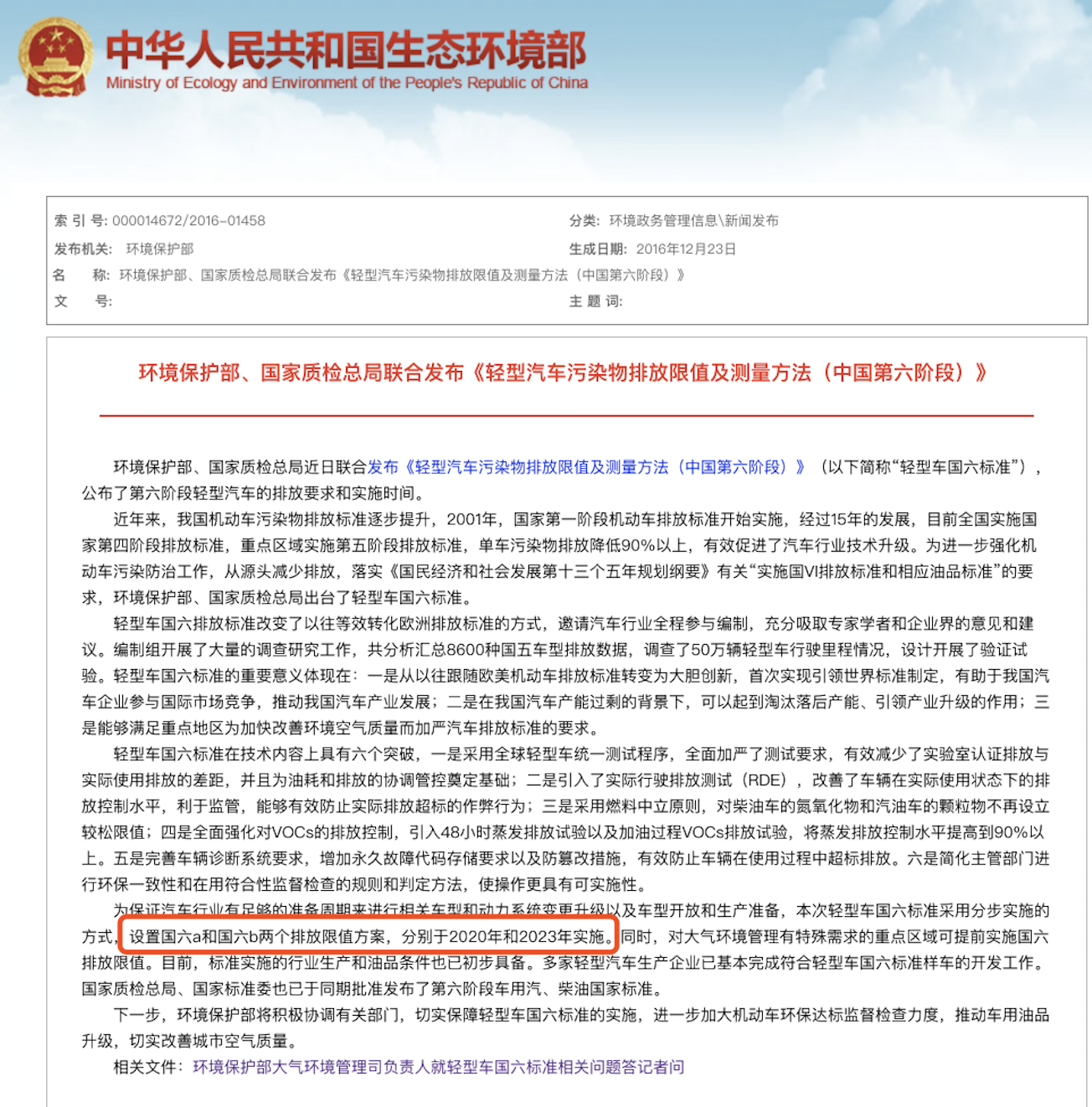 经过几十年的改革开放,我们国家逐渐富强,社会不断进步,人民群众对生活品质的要求越来越高。现如今,我们不仅追求吃穿要好,还需要清洁的空气、干净的水。国家当然在积极响应群众的诉求,因此,我们的政府在《国民经济和社会发展第十三个五年规划纲要》中明确提出了要“加快改善生态环境”的要求。在这个背景之下,环境保护部和国家质检总局联合发布了《轻型汽车污染物排放限值及测量方法(中国第六阶段)》(既“轻型车国六标准”)。
