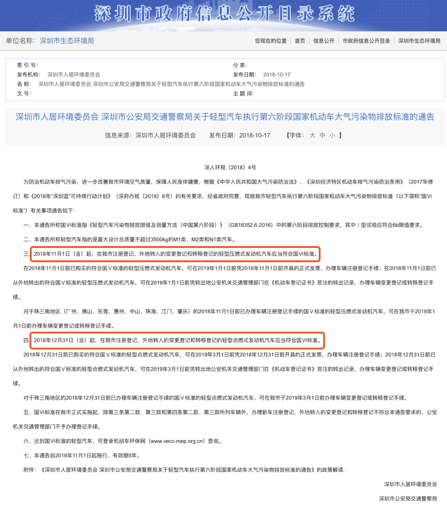 深圳市人居环境委员会关于轻型汽车执行第六阶段大气污染物排放标准的通告