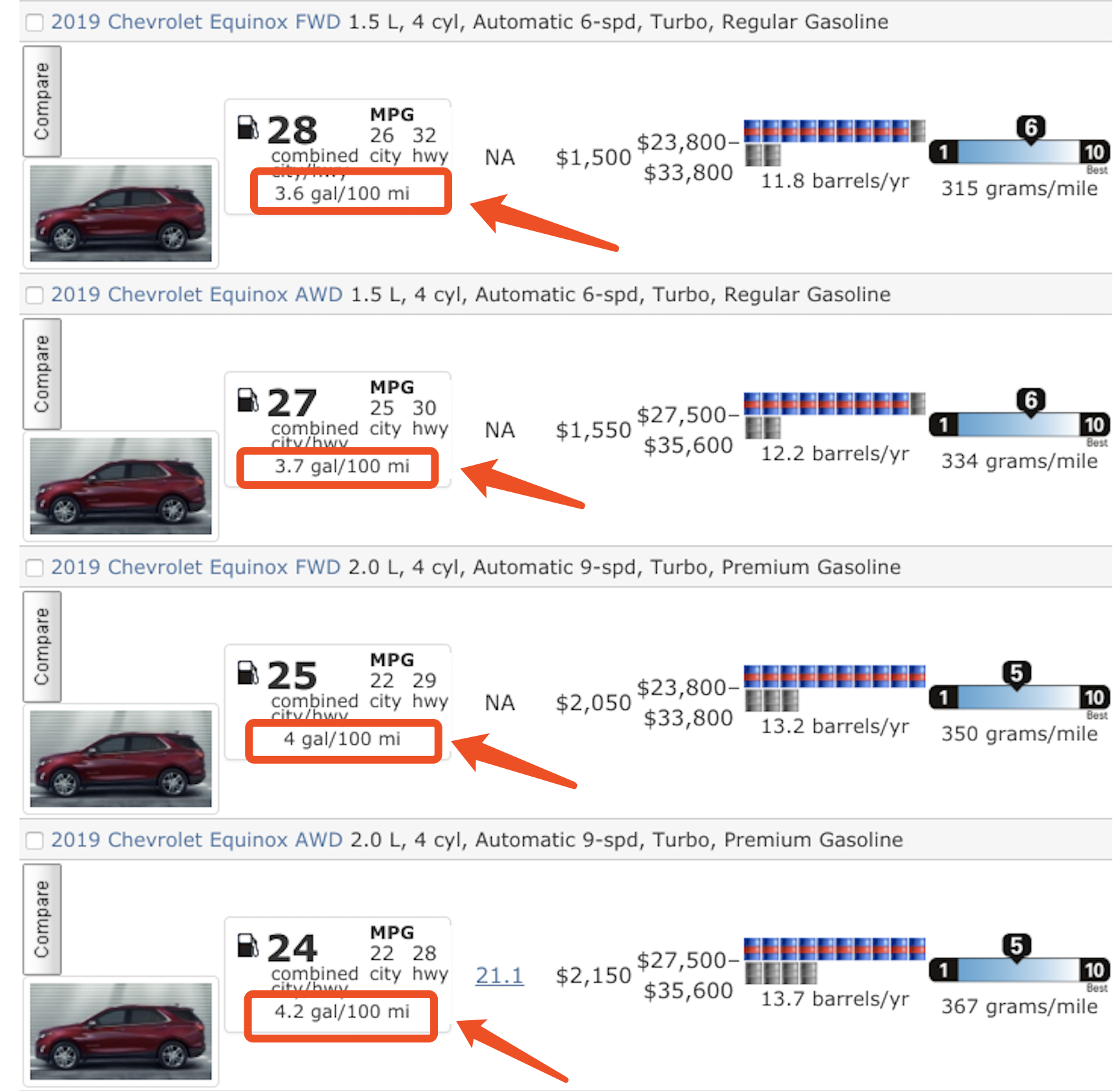 2019款雪佛兰探界者,1.5T发动机加6速自动变速箱版本,两驱车型百英里油耗为3.6加仑,四驱车型百英里油耗为3.7加仑;2.0T加9速自动变速箱版本,两驱车型百英里油耗为4加仑,四驱车型百英里油耗为4.2加仑。
