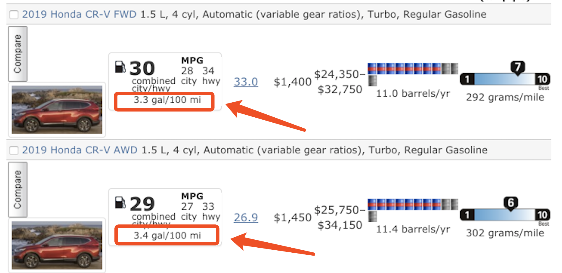 2019款本田CR-V,两款车型均配备1.5T涡轮增压发动机加CVT变速箱,前驱车型(FWD)百英里油耗为3.3加仑,四驱车型(AWD)百英里油耗为3.4加仑。