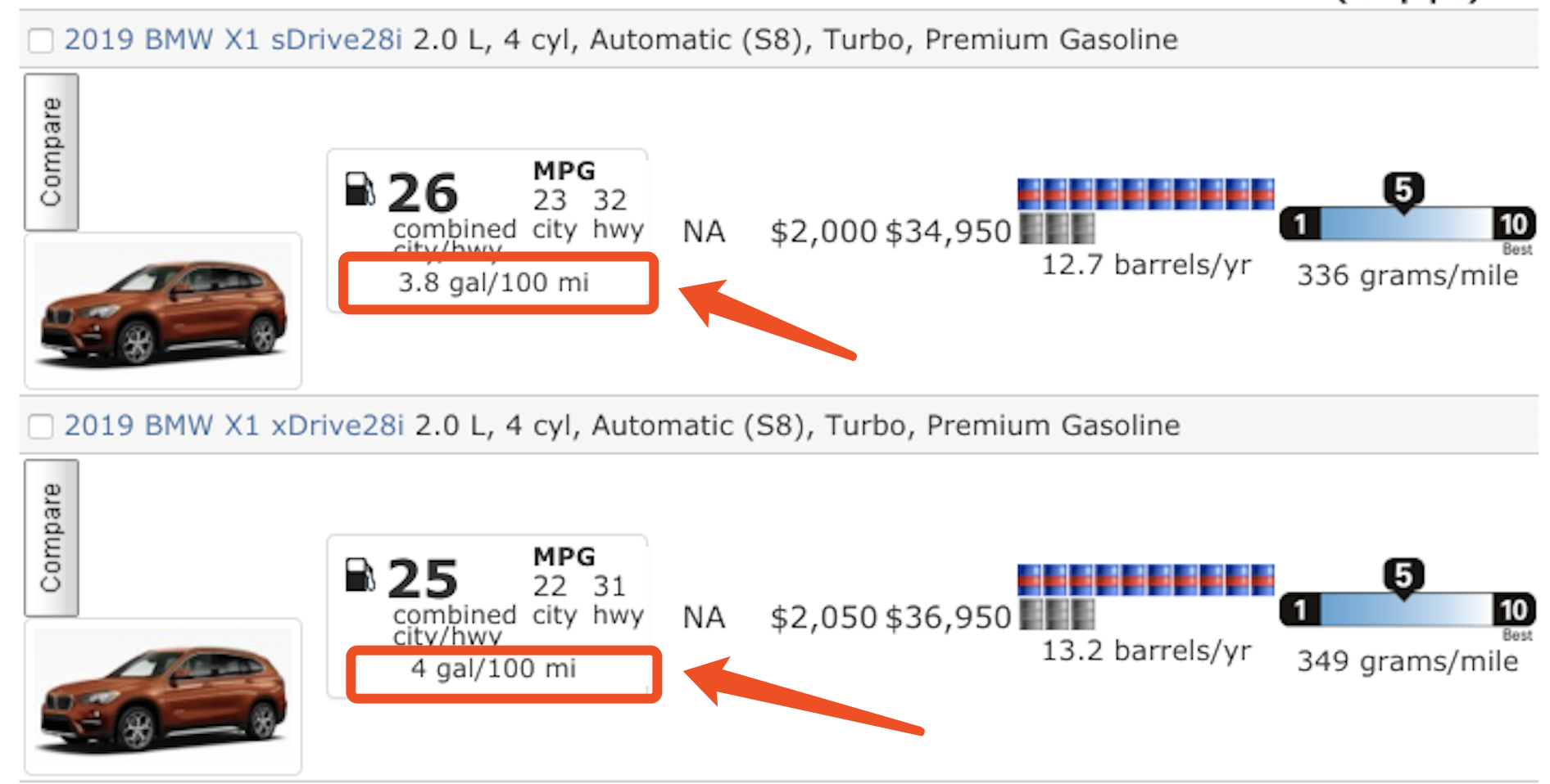 2019款宝马X1,对比的两款车型均搭载2.0T涡轮增压发动机加8速手自一体变速箱。sDrive两驱车型百英里油耗为3.8加仑,搭载适时四驱系统的xDrive车型为4加仑。