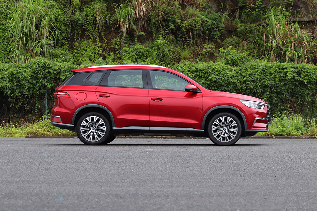 视线转移至侧腰,宋Pro DM定位A+级大五座SUV,长/宽/高:4650/1860/1700mm、轴距:2712mm,35:65黄金比例车身搭配设计搭配为中国市场开发的赤帝红车漆,乍眼一看有几分“小唐DM”的磅礴气势。