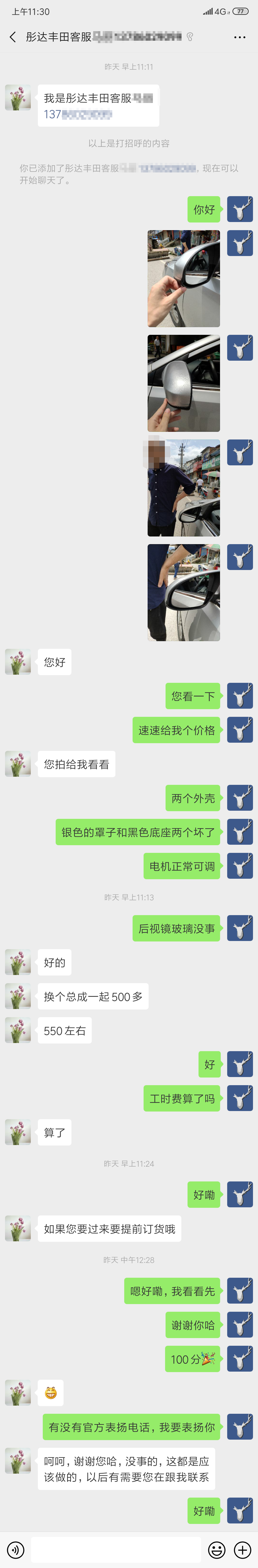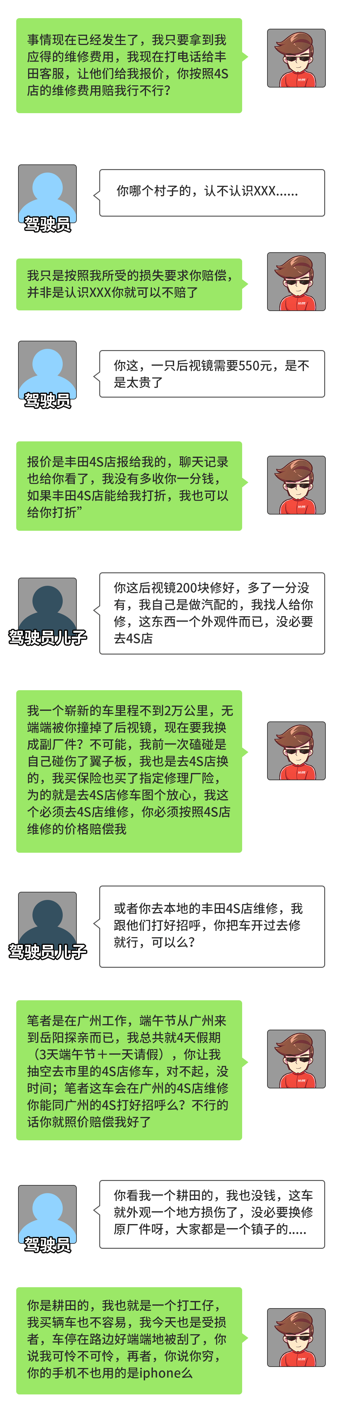 其一是笔者知道这只后视镜的维修价格不过几百元没必要出保险,其二则是镇上偏僻想要等交警和保险来想必要耽误半天,既然驾驶员提出私了,笔者就告诉驾驶员:“事情现在已经发生了,我只要拿到我应得的维修费用,我现在打电话给丰田客服,让他们给我报价,你按照4S店的维修费用赔我行不行?”