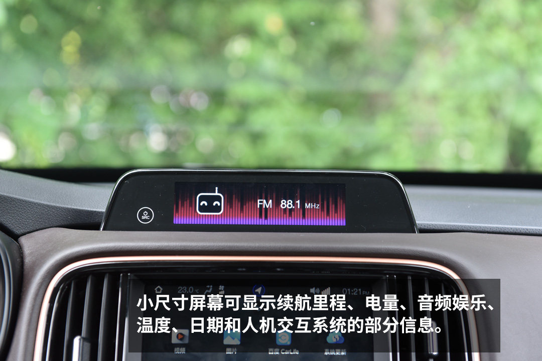 更重要的是,它采用了11.1英寸的液晶仪表盘,中控区域设置了10英寸触控屏,在它上面还有一个设置了一块小液晶屏,它可以直观显示续航里程、电量、娱乐系统信息、温度、日期甚至还能显示人机交互系统的部分信息。