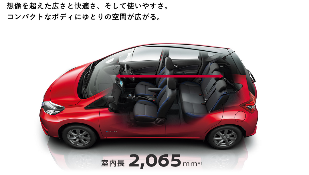 省油不是NOTE成功的唯一原因,空间大也是一个原因。日产NOTE仅长4140mm,但是轴距就达到了2600mm,跟一台紧凑型轿车差不多,轴距大部分又转化成乘坐空间。这就是NOTE成功的秘诀。