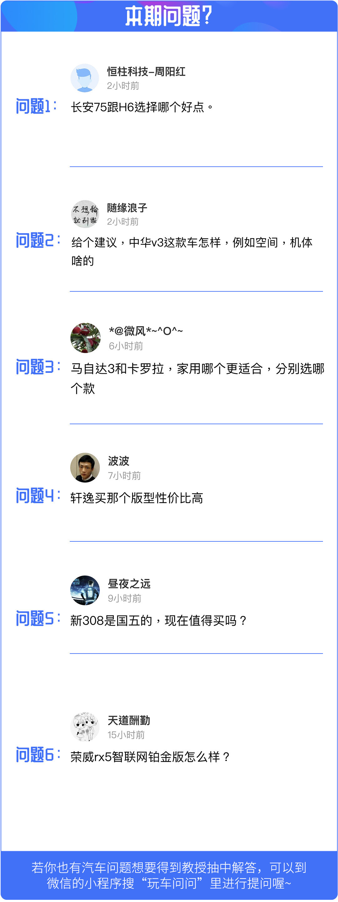 在网友问答栏目中教授将会在小程序-玩车问问里挑选6个问题进行回复,如果对购车、用车有什么疑问的话,欢迎点击下方玩车问问小程序,有许许多多非常厉害的技师为你解答喔!