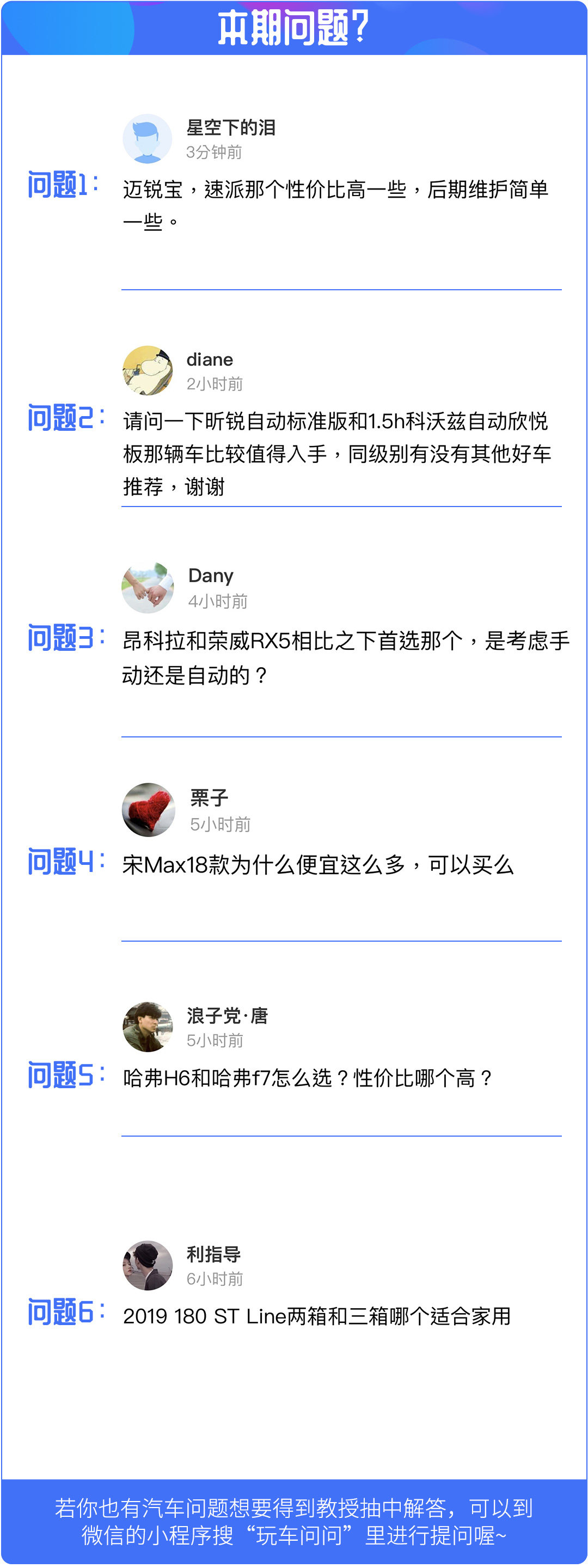 在网友问答栏目中教授将会在小程序-玩车问问里挑选5个问题进行回复,如果对购车、用车有什么疑问的话,欢迎点击下方玩车问问小程序,有许许多多非常厉害的技师为你解答喔!