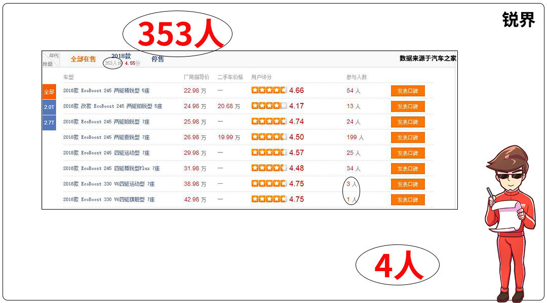 福特锐界2019年前4个月的销量约为10000台,V6车型的评分占比为4/353,模糊估算V6的销量为114台.