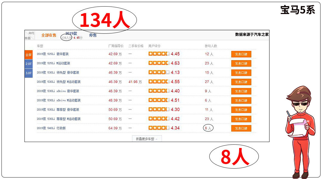从之家的截图来看,133人中行政版的评分只有8人,今年4个月宝马5系的销量为4万余台,模糊估算行政版的销量约为2400台。这已经是这么多V6车型里销量最高的一个了,这个数据与宝马5系是中大型车中最热门的车型有关,虽然家用的人群都买了2.0T车型,但商务用途人群为了区分家用,选择行政版5系要更加有气势。