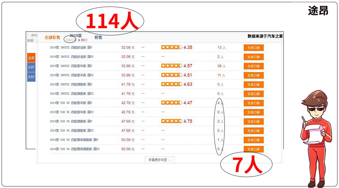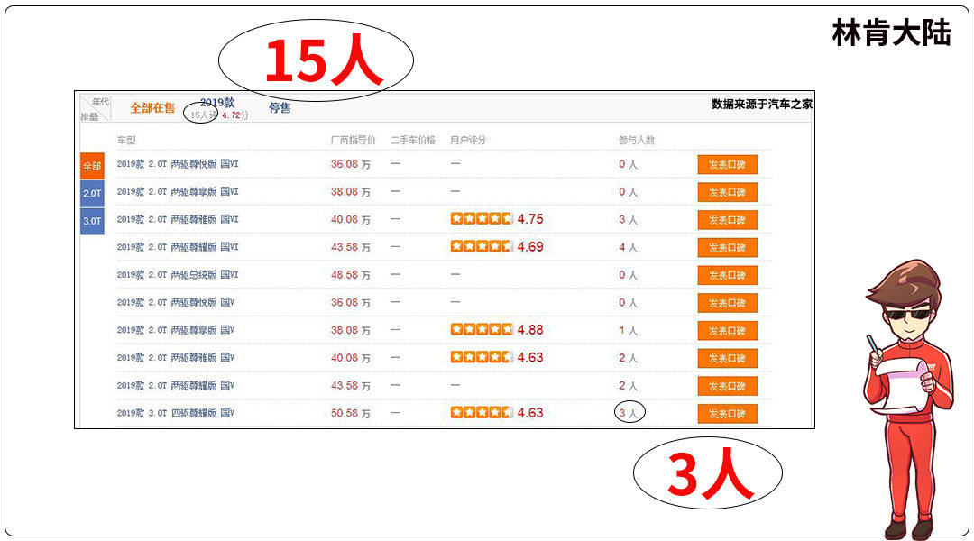 下面通过一组数据来揭露目前拥有V6版的车型的处境,事实上某一辆车具体某个车型的销量我们是查询不到的,不过我们可以通过之家评分占比来估算出大概的车型销量,虽然是模糊估算,但起码有数据的支撑。