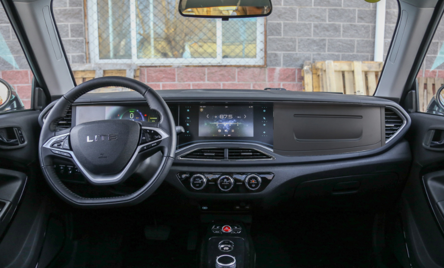 LITE虽然是一款纯电动车型,但并没有取消全部的实体按钮。可以说碍于成本的考量,也可以说为了实用性考虑,像空调等按钮采用物理按键设计,可盲操作。换挡机构为旋钮式,方向盘双幅式,常规配置,见多不怪。