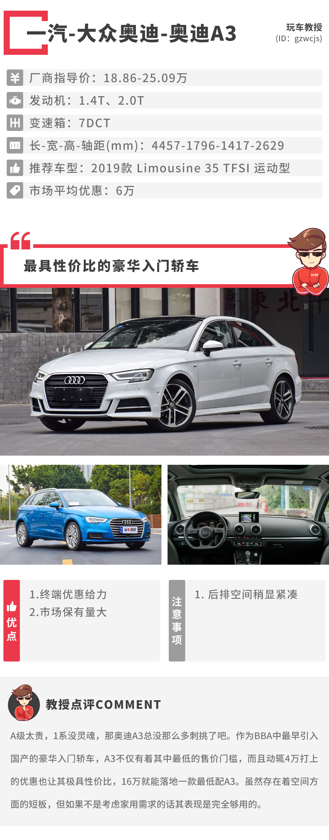 总的来说,这些豪华品牌下探车型并不适合大多数消费者,虽然售价更低但也没达到亲民的地步,而且日常养护也比一些主打实用性的家轿更高。这些都是它们的短板。就一般消费者买车的话,这几款绝对不在教授的首推范围内,但如果你有比较充裕的购车资金,而且也有比较强烈的想法想体验一下豪华品牌的魅力,那么这几款入门级轿车绝对值得考虑一下。