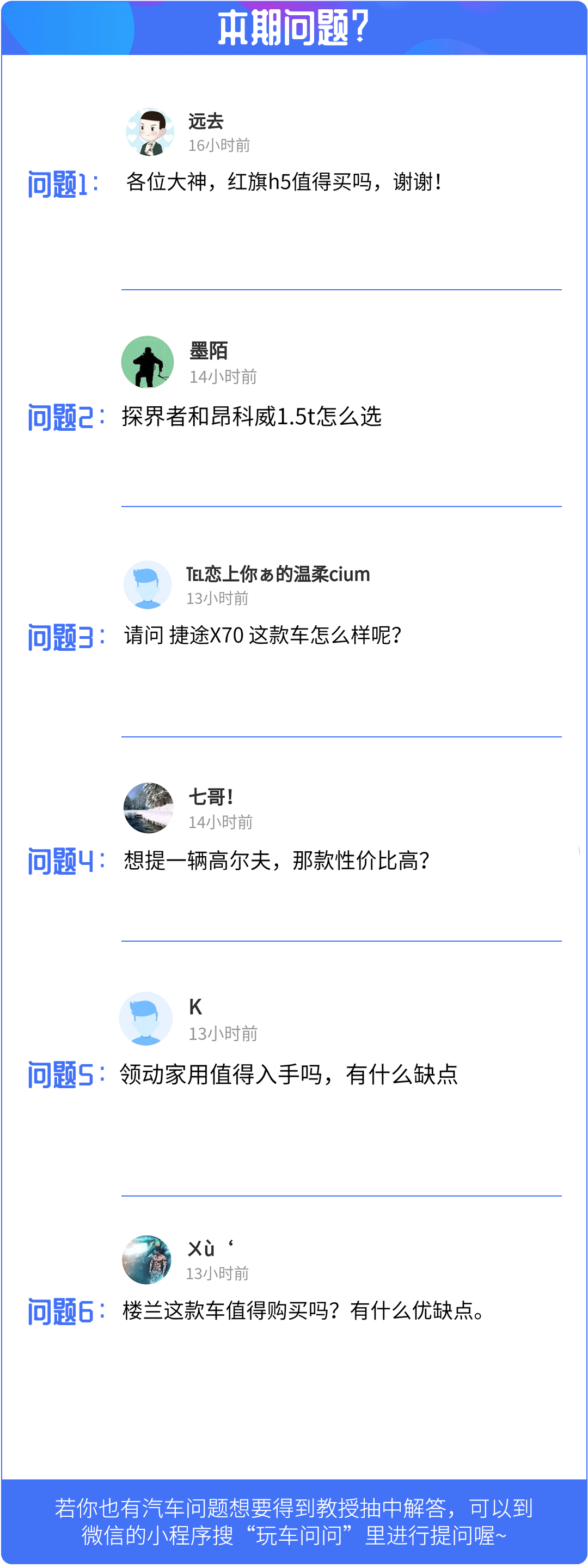 在网友问答栏目中教授将会在小程序-玩车问问里挑选5个问题进行回复,如果对购车、用车有什么疑问的话,欢迎点击下方玩车问问小程序,有许许多多非常厉害的技师为你解答喔!
