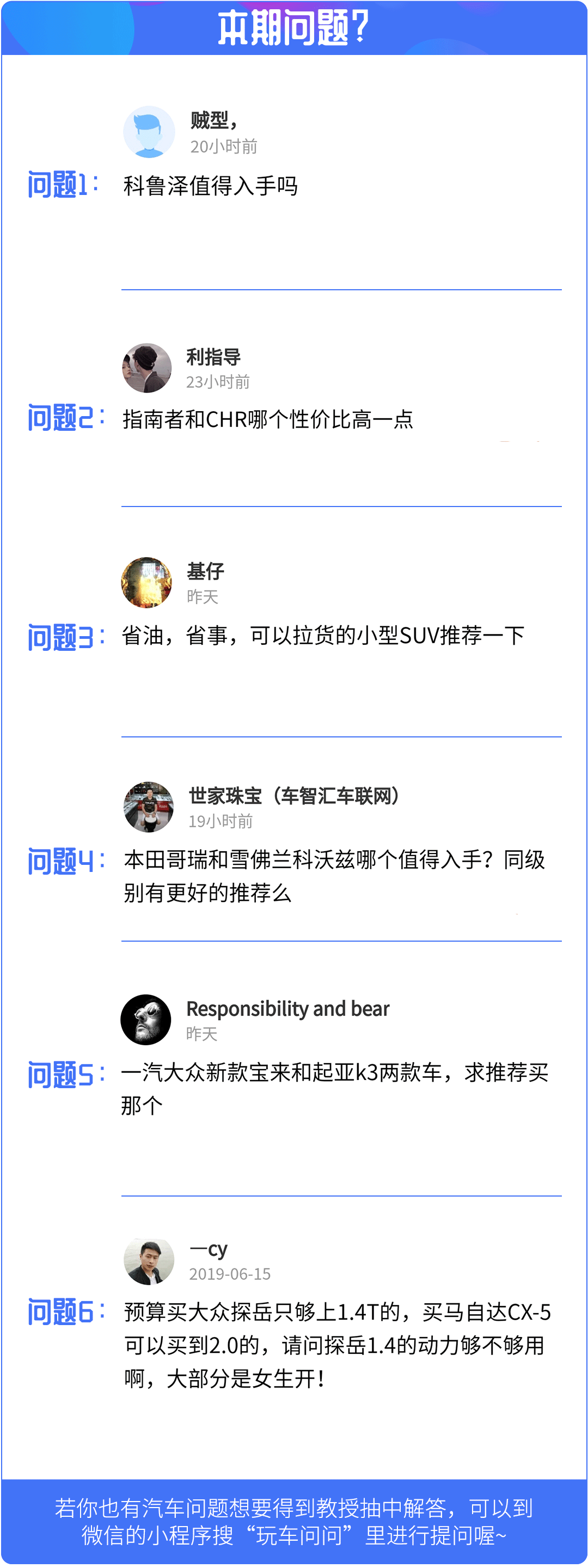 在网友问答栏目中教授将会在小程序-玩车问问里挑选5个问题进行回复,如果对购车、用车有什么疑问的话,欢迎点击下方玩车问问小程序,有许许多多非常厉害的技师为你解答喔!