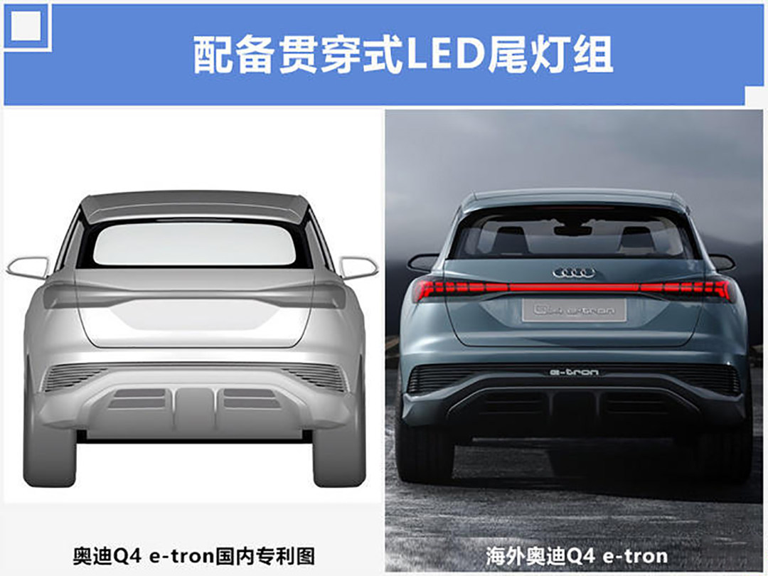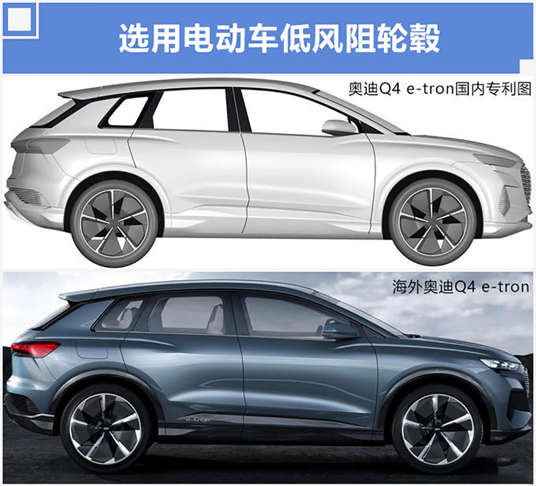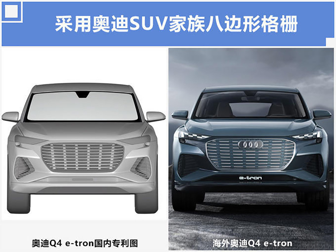 日前,国家专利局公布了奥迪Q4 e-tron专利图,由图可见,量产版车型外观与海外概念版车型别无二致。