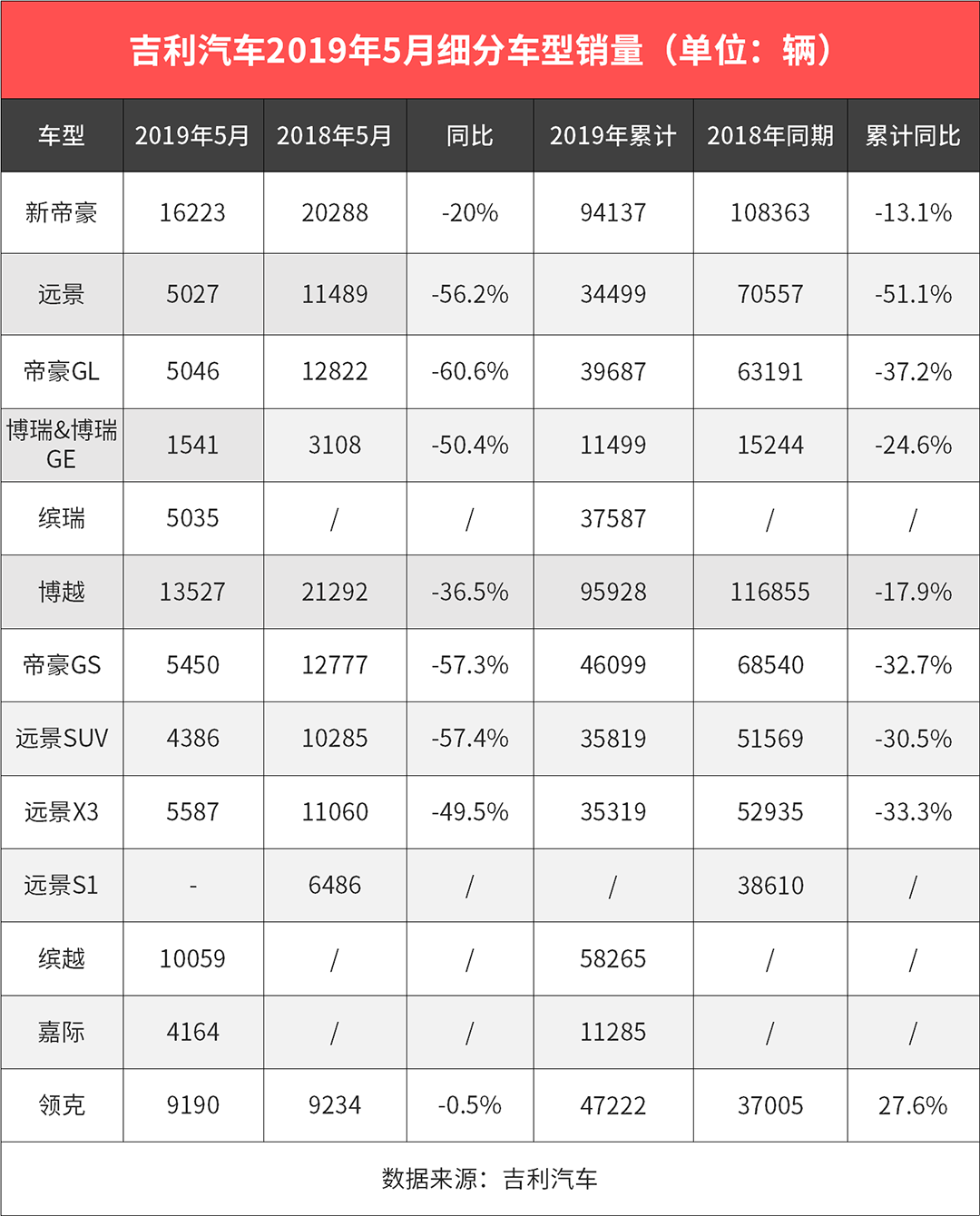 6月10日,吉利汽车发布5月销量数据,5月份吉利汽车共销售汽车90309辆(含领克),同比下滑约27%,环比下滑13%,而且吉利今年1-5月总销量560805辆,同比下滑约12%。