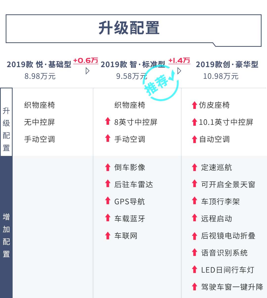 从配置入手,教授觉得中配2019款 智·标准型更有性价比,值得购买,基本上车上实用的配置该有的都有了。有人会问,为什么不推荐次顶配,那是因为相对于中配,只增加了一个皮质的座椅、智能云服务以及 LED 日间行车灯而已。不过官方消息称,次顶配在6月份购买会限量赠送 Sport+运动套装以及送 Smart+智能套装,这样看起来这段时间性价比还是不错的,可就剩十几天了,买车不会这么着急吧?