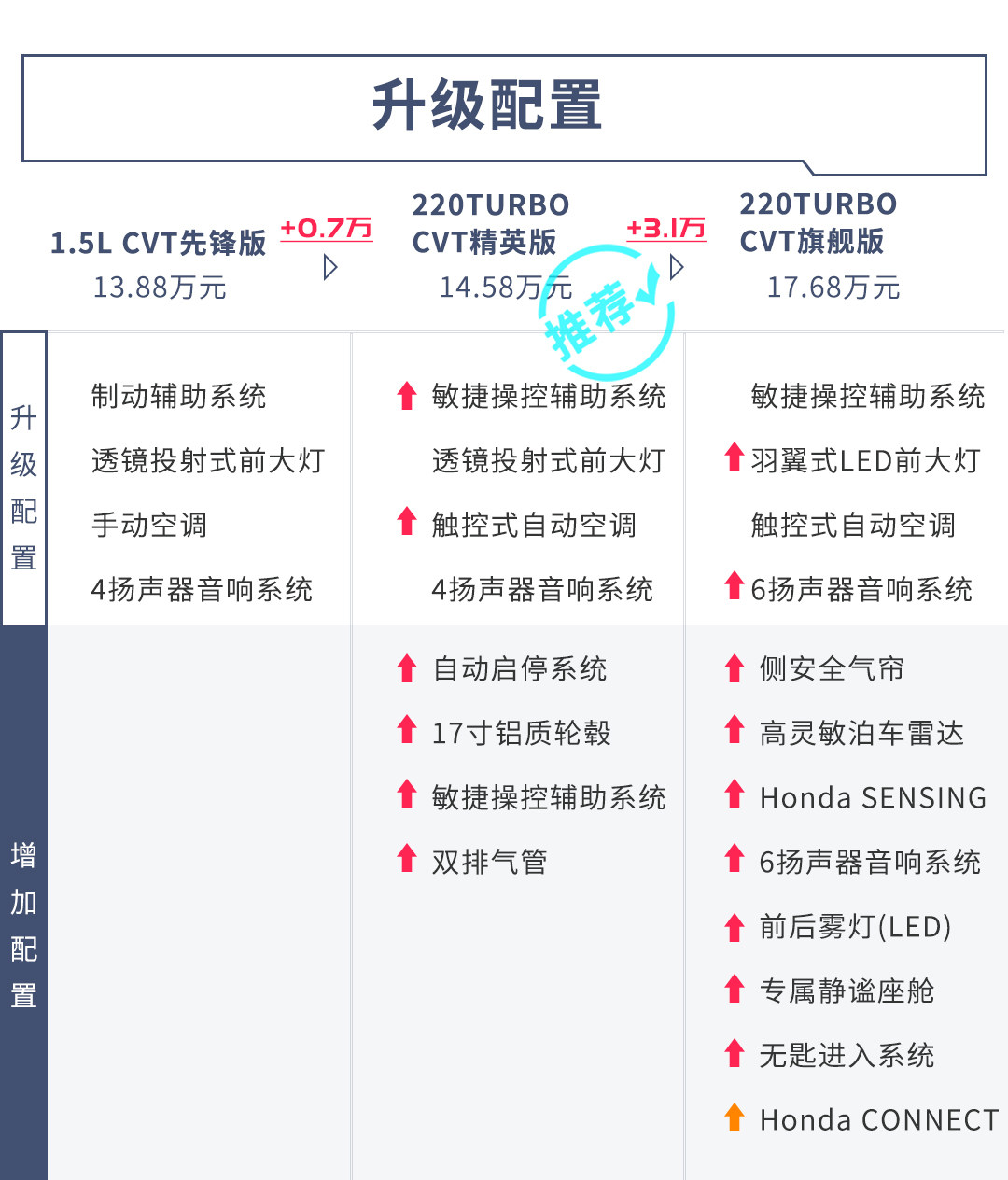 6月18日晚上,在经过中期改款后,广汽本田缤智终于迎来了上市。新车共推出6款车型,售价区间为12.78-17.68万元,分别搭载1.5L或1.5T发动机。改款后的缤智在外形上终于与海外版接轨,并且部分配置也得到升级。其中最大的变化就是来自于搭载的1.5T发动机,动力上有明显的提升。那么在6款车型当中,买哪一款才是最划算之选呢?