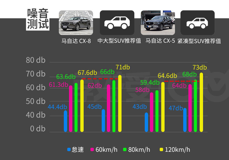 在大多数消费者的惯性上,操控好与车厢静谧性可能是相反的存在体,但马自达大部分车型就打破了这种固有情况。由于都采用创驰蓝天系列发动机,自然吸气发动机在隔音上的优势,这个时候就会凸显出来。通过之前在对CX-5和CX-8的综合测试中,我们惊奇的发现,它的隔音要比同级别竞争车型要更加突出。在怠速、60km/h、80km/h及120km/h的不同运行速度上,CX-5都能够做到很优异的成绩。就算是去到大7座车型--CX-8,马自达依然将这个优良传统给保持下来。