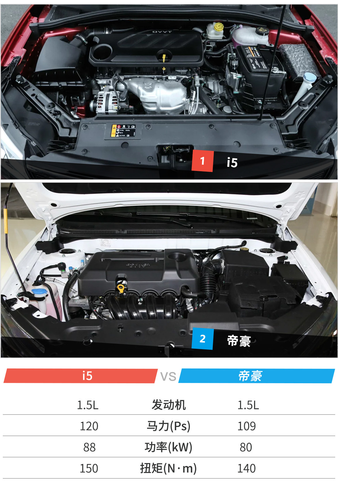 动力上,两款车使用的都是1.5L自然吸气发动机+CVT变速箱的组合,荣威i5在峰值扭矩和最大马力上领先帝豪,不少用户实际用车后给出了“轻踩油门也能感受到明显的动力输出”、“响应快”、“动力足”等评价。