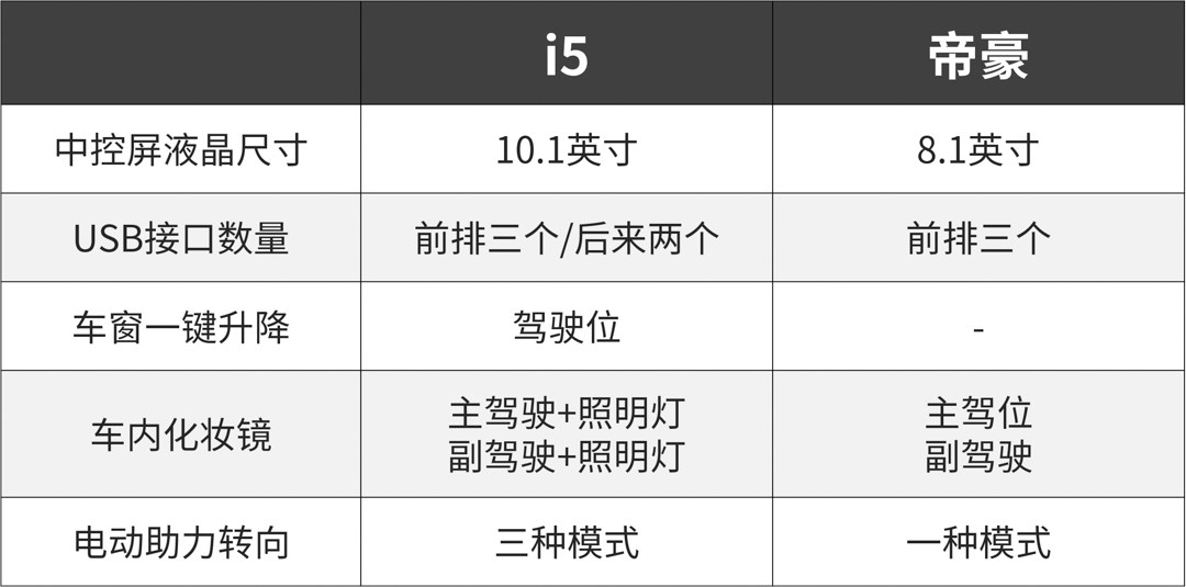 i5的实用性配置更多,相比帝豪,多了后排USB接口、驾驶位车窗一键升降、化妆镜照明灯、以及方向盘三种转向助力模式等,比帝豪更有诚意。