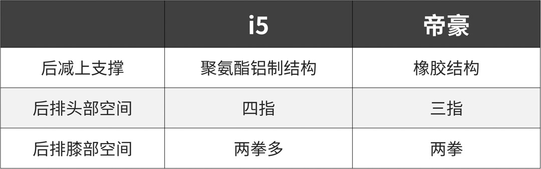 教授常说,买车不能只看配置表,同样的配置带来的体验可不一定一样。i5和帝豪使用的都是这个级别普遍配备的前麦弗逊式、后扭力梁式悬架,但是i5的后悬架减震器与弹簧分离,减震器能够单独调节,带来的好处是悬架反应更灵敏,控制车身姿态更精准,这种设计在朗逸和凌渡上也被采用。此外,i5减振器上支撑采用的聚氨酯铝制结构,比帝豪使用的橡胶结构更下本,好处是滤震效率提升了,后排乘客的舒适感得到增强。