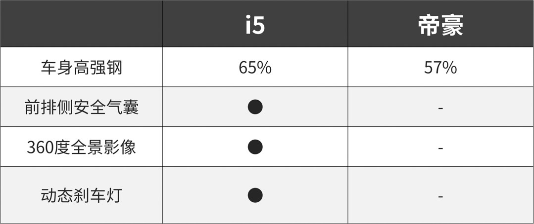 更重要的安全配置上同样是i5领先,全车高强度钢使用使用率高达65%,领先帝豪的57%。更坚固的骨架还不够,i5还加持了前排侧面安全气囊和动态刹车灯,尤其贴心的是加入了同级少有的360度全景影像功能,软硬兼施,相当周全。而帝豪全系连全车安全带未系提醒这种基础配置都未配齐,有待改进。