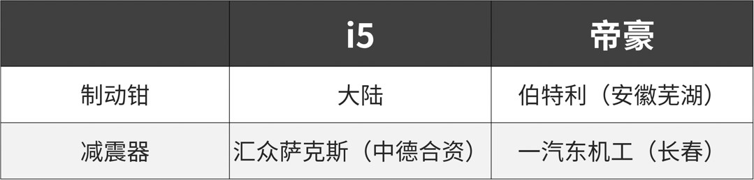荣威作为上汽集团的亲儿子,可以依托集团背景获得更多的资源,其中包括得到全球知名零部件供应商的支持,比如荣威i5的制动钳由德国大陆提供,后减震器来自中德合资的汇众萨克斯。起初2010款帝豪采用的是博世的制动轮边,但2018款帝豪的制动轮边供应商变成了芜湖伯特利,成本降了,品质也滑坡了。
