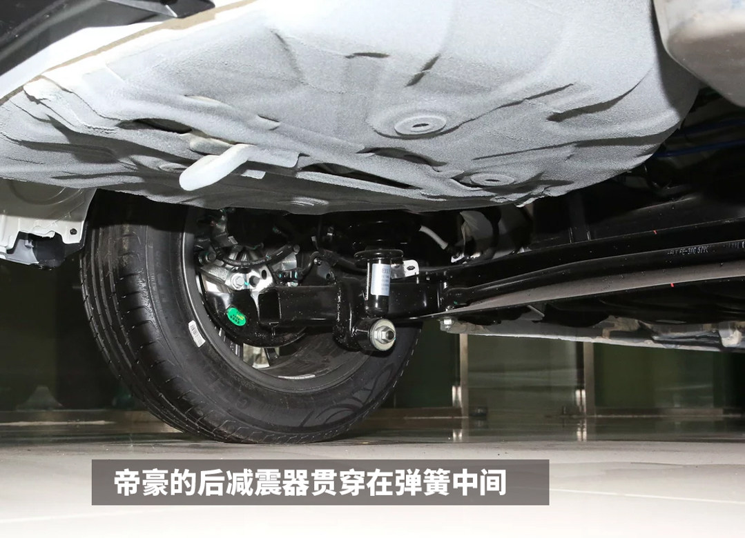 帝豪的后减震器贯穿在弹簧中间,是20年前的做法,现在已经鲜有车在用,这样的设计构造简单,成本低。但是会侵占后排空间、舒适性较差、年限久了异响严重,还易让减震器出故障、缩短其寿命,安全性堪忧。