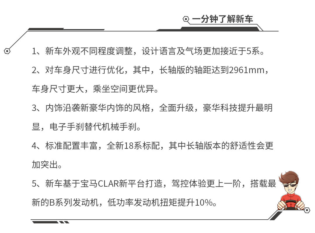 首先从理论上来讲,新车基于CLAR新平台打造,5系老大哥等多款车型也是基于该平台生产,其在操控方面的实际表现有目共睹。其次,车身保持了50:50的前后轴完美配重比的同时,还对车身刚性、车身重心,前后轮距等进行优化,一切皆服务于驾驶。其中,车身刚性整体提高20%,底盘局部更是提高了50%,车辆重心降低10mm。最后,宝马车型在加长轴距后操控优势的保持能力,从之前的3系车型就可以看出。
