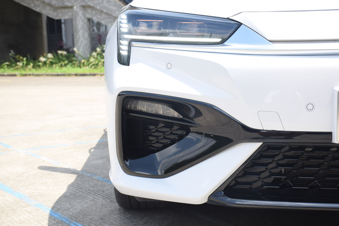 包围下方亮黑色的塑料装饰件与车身同色的装饰件结合,营造出一种运动车的气质;此外,前杠两侧设置了通风口,能够将轮拱处的乱流带走,使得车辆达到0.245Cd的风阻系数,这对于一台纯电动车来说,也有利于增加车辆的续航。