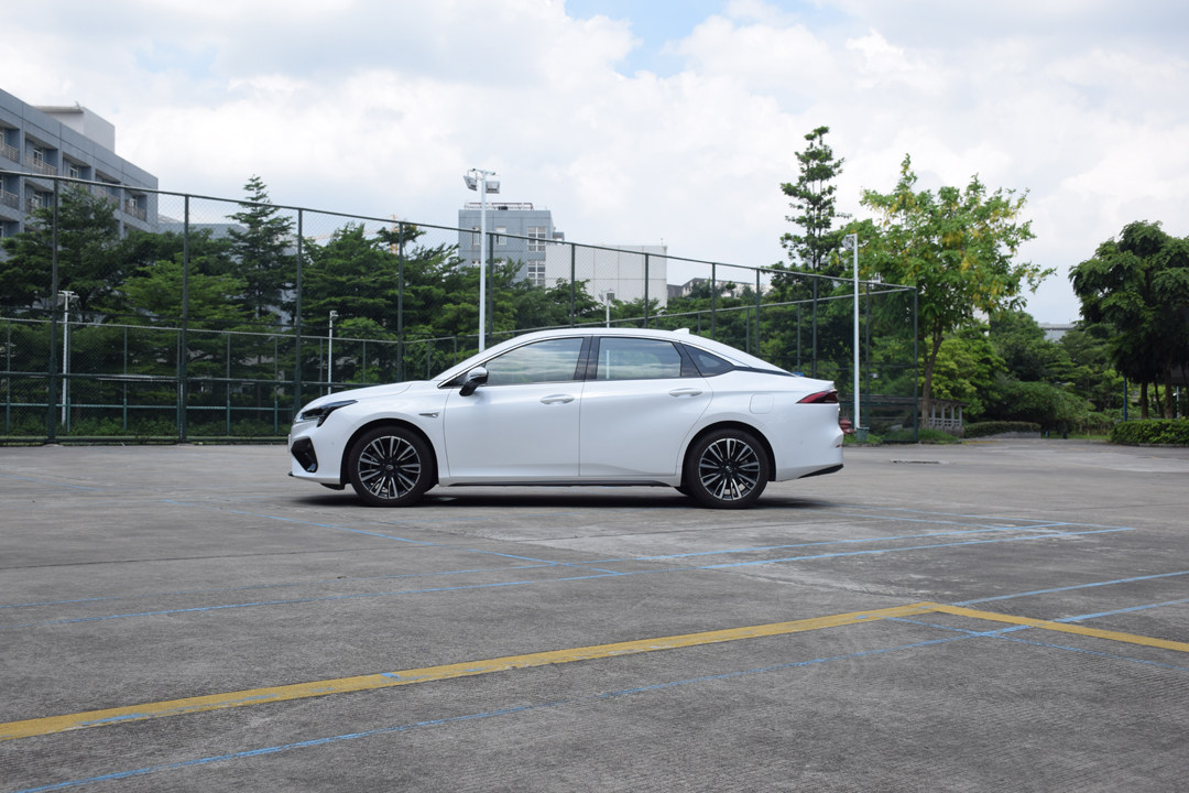 来到车身侧面,客户在预订的时候可以免费选择双色车身,营造一种悬浮式车顶的感觉。235/40 R19的轮毂跟一些同样新能源的车型不同,也许更加窄小的轮胎有助于车辆的续航能力,但Aion S并没有选择此发方案,相反使用的是更加注重性能的米其林PS4S轮胎。