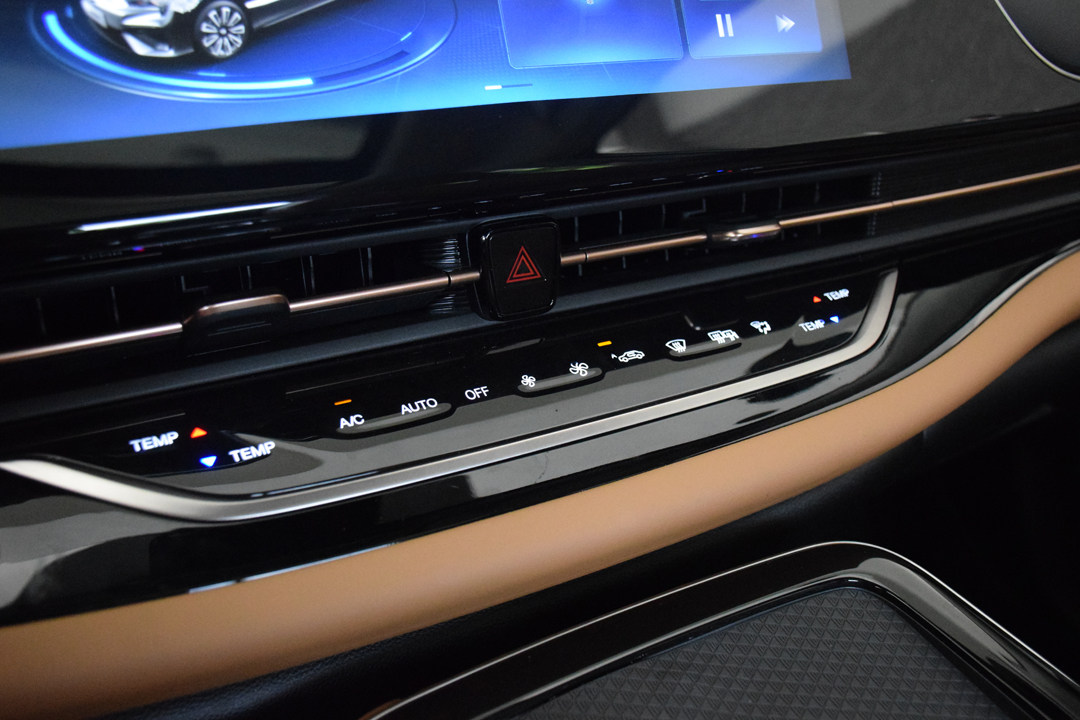 走进车内,内饰同样是使用了从奔驰上流行开来的仪表和中央显示屏联通的设计,好处是能够增加车厢内的整体感和高级感,好在两块屏幕的尺寸都足够大,不会留有过大的黑边。此外,空调出风口以及下方的控制按键让整套内饰的层次感很分明,并且一些常用的功能使用实体按键设置在中央操作区域,但是一些细节的操作例如座椅的通风和加热,就要进到车辆菜单里面打开或关闭。这也算是为了设计而牺牲了一些实用性。