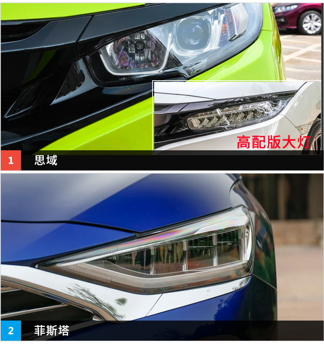 两款车的前大灯造型都是矩阵式的,科技感都不错,思域的日间行车灯集成在大灯里,菲斯塔则设置在雾灯区域。