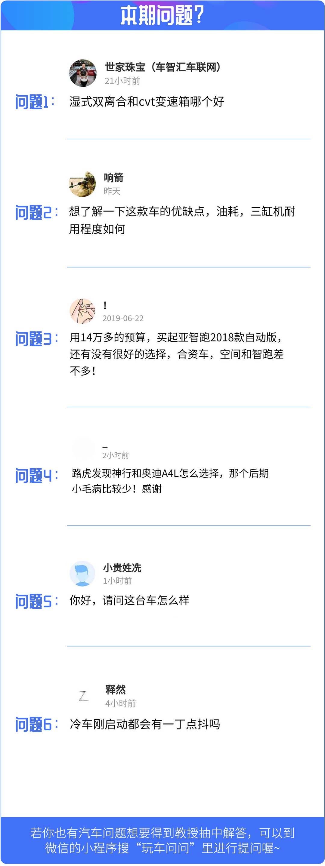 在网友问答栏目中教授将会在小程序-玩车问问里挑选5个问题进行回复,如果对购车、用车有什么疑问的话,欢迎点击下方玩车问问小程序,有许许多多非常厉害的技师为你解答喔!